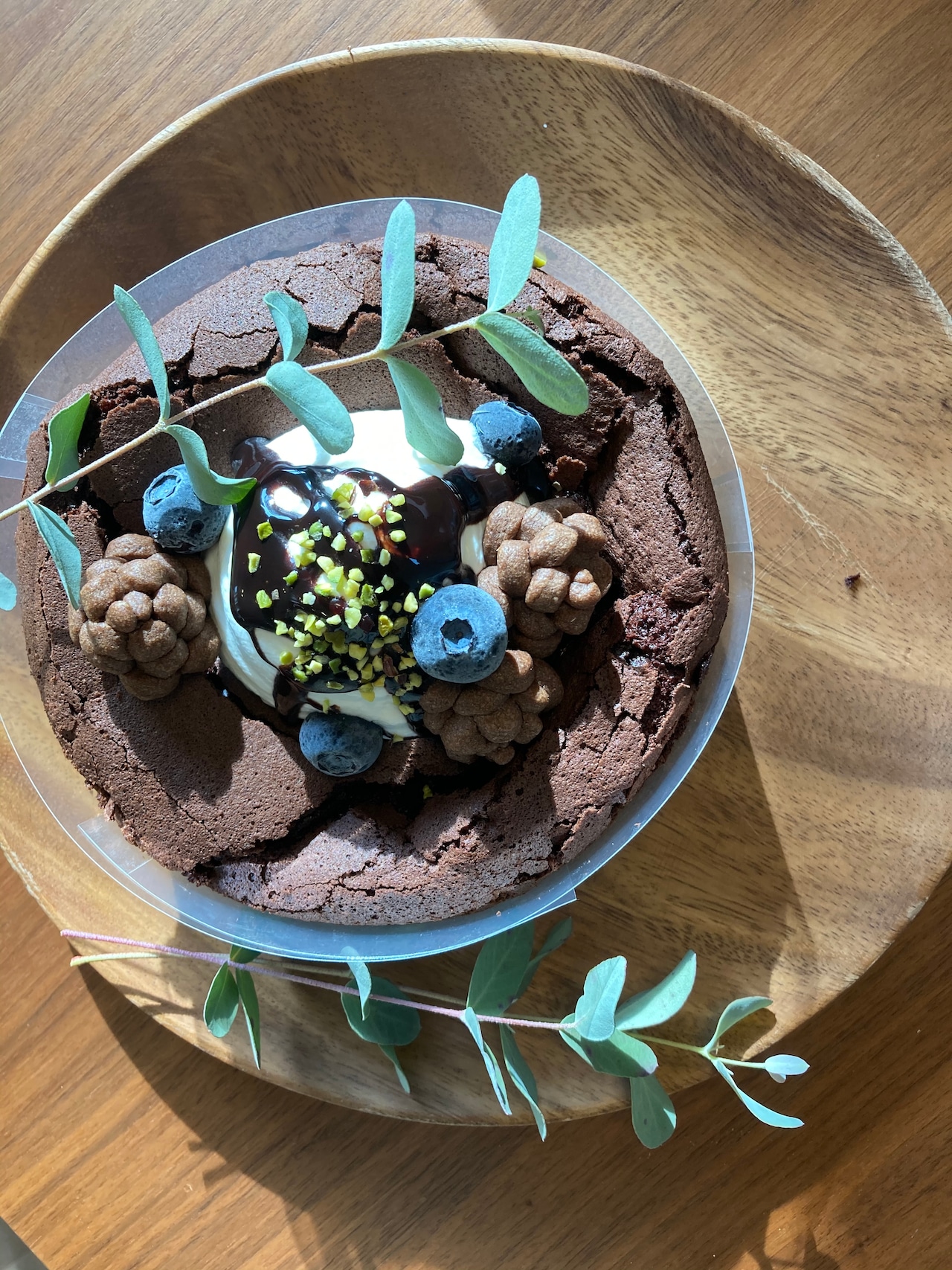トップのデコレーションは生クリームと松ぼっくりクッキーとチョコソース、ブルーベリーのみとなります。